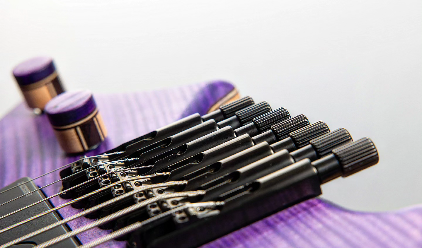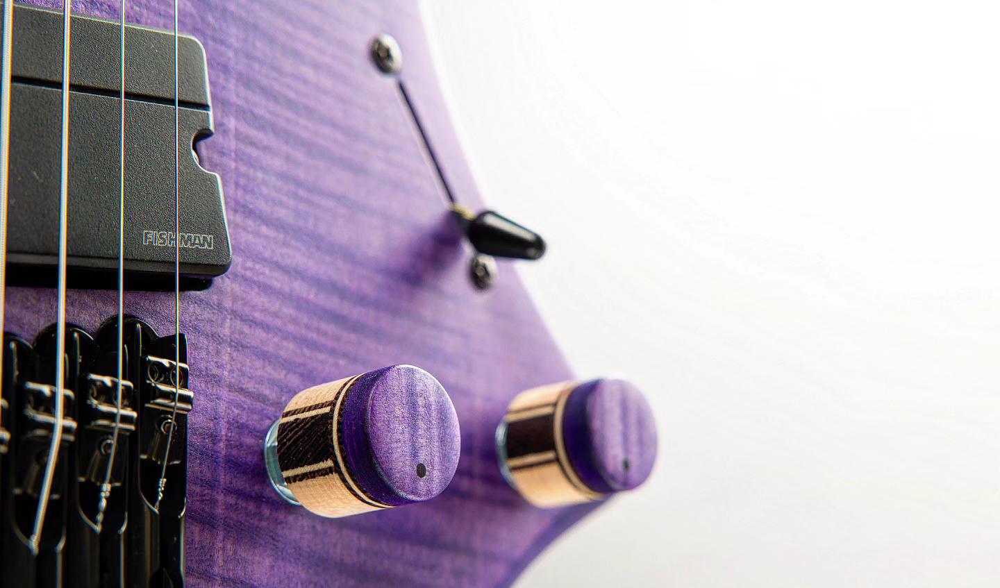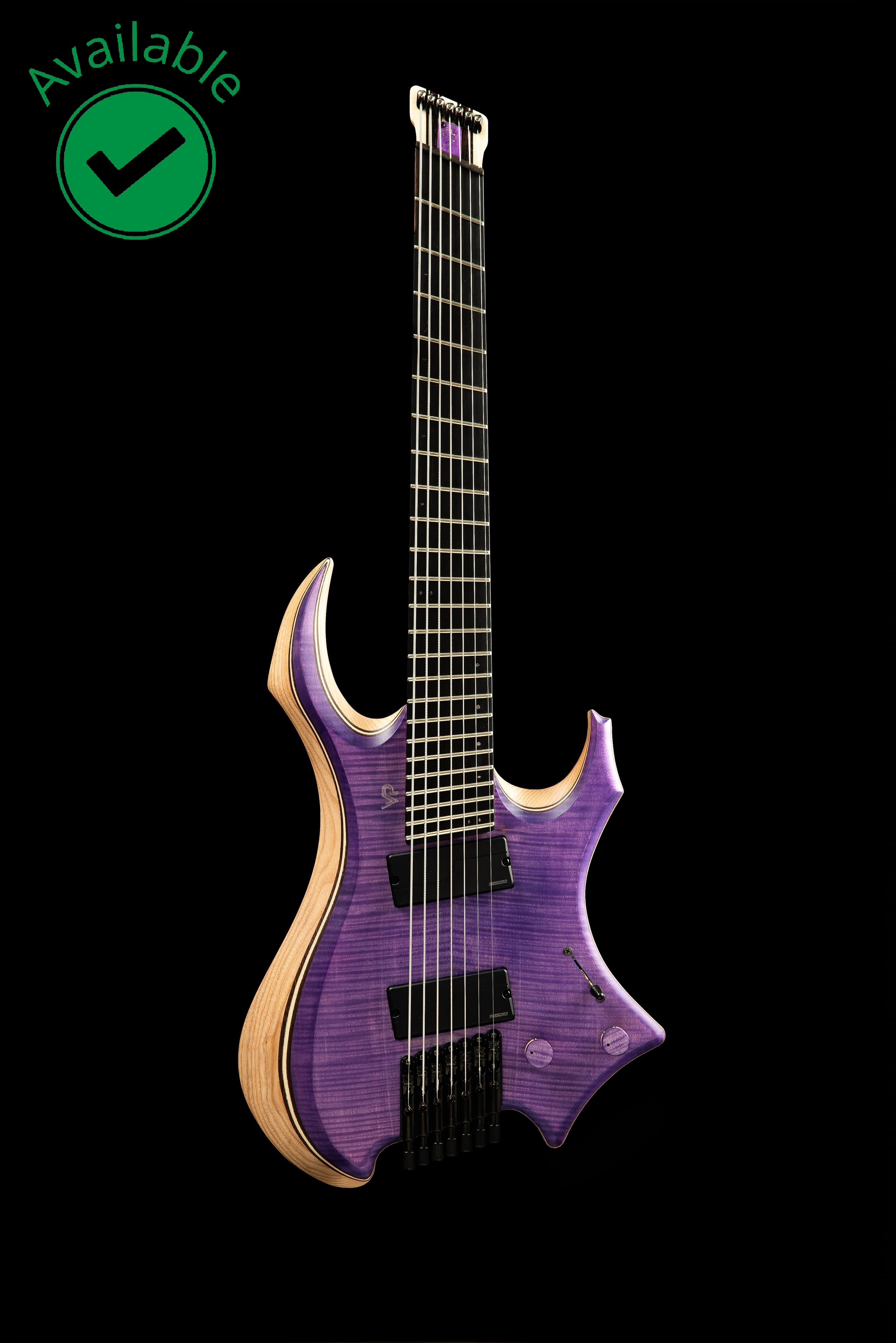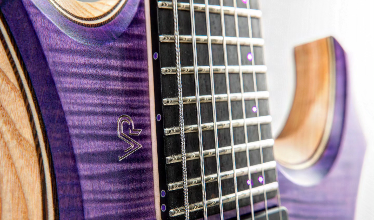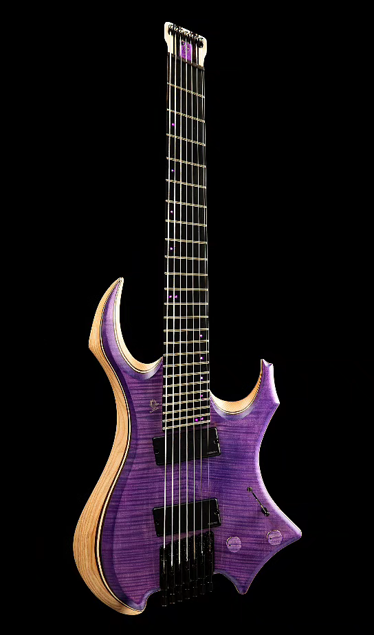 Fretboard: 27” – 25.5” ebony, 20” radius, violet sidedots, violet led