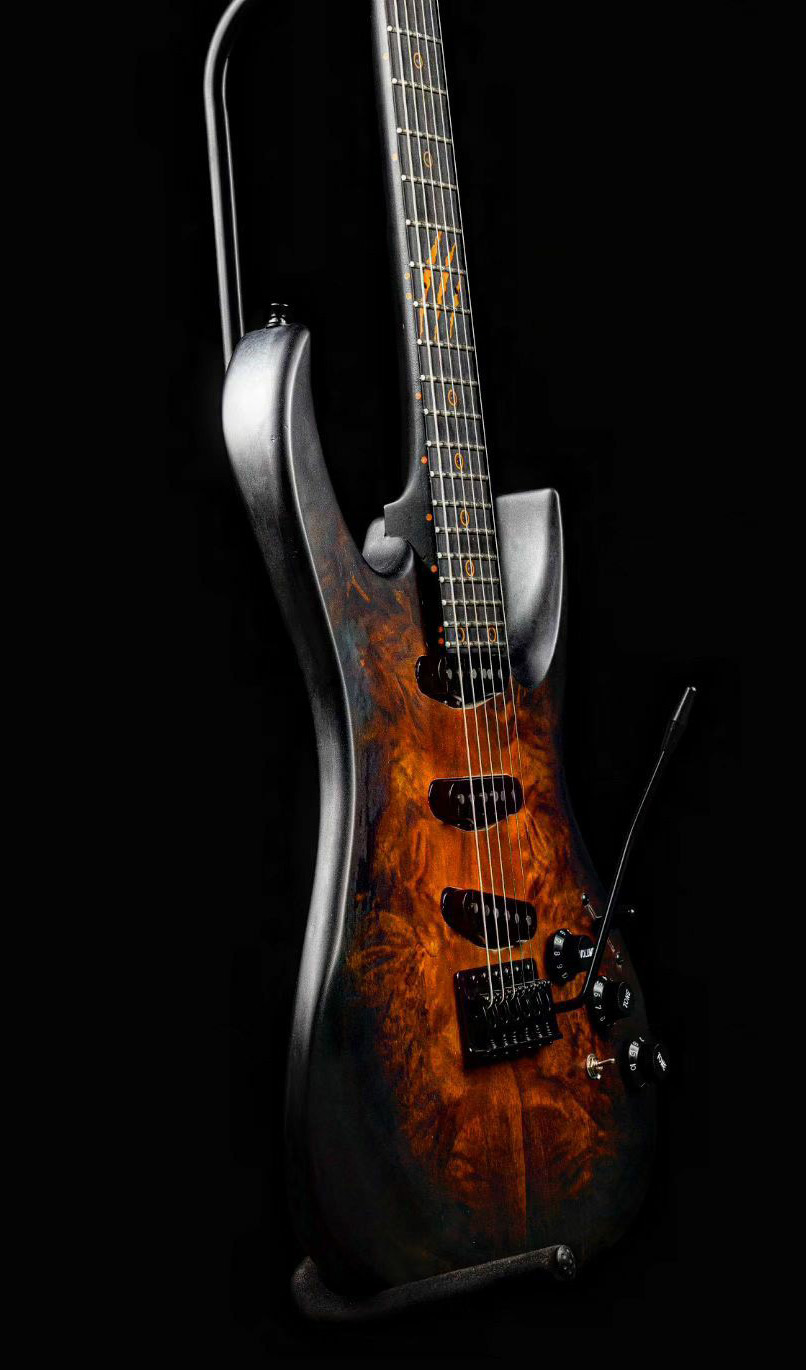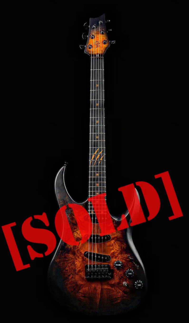 Fretboard: 25.5″ ebony, 16″ radius, orange led, dot and sidedots, orange inlays