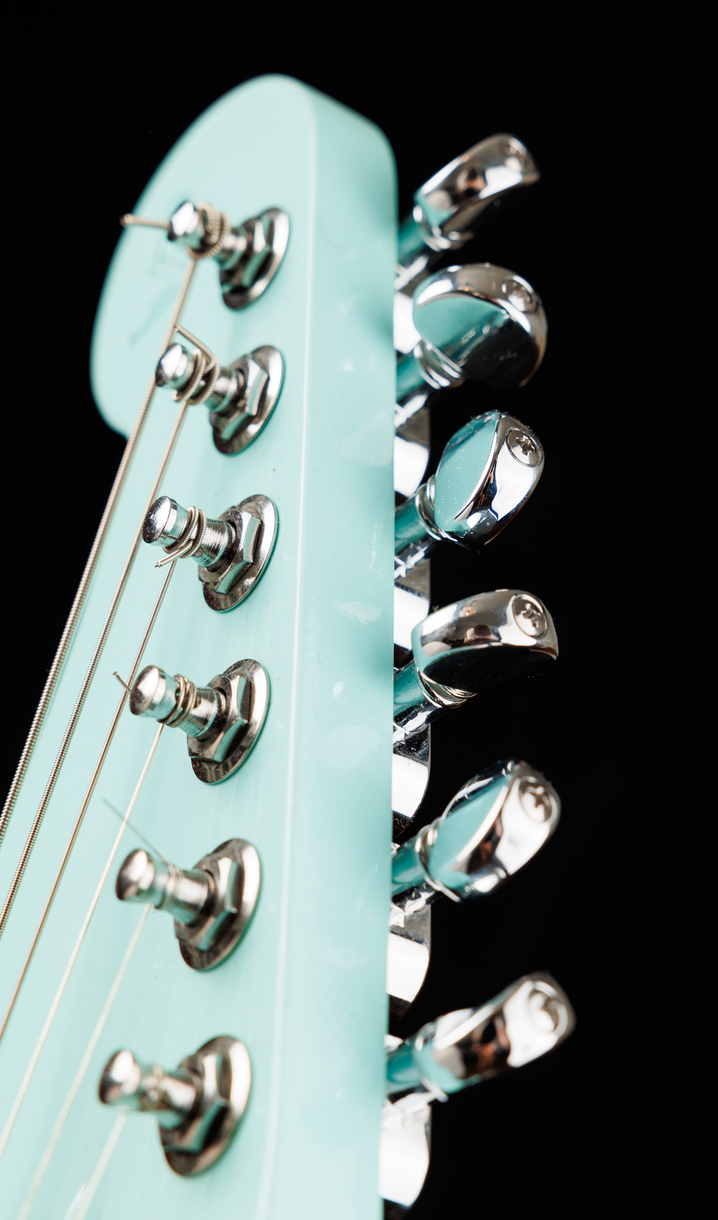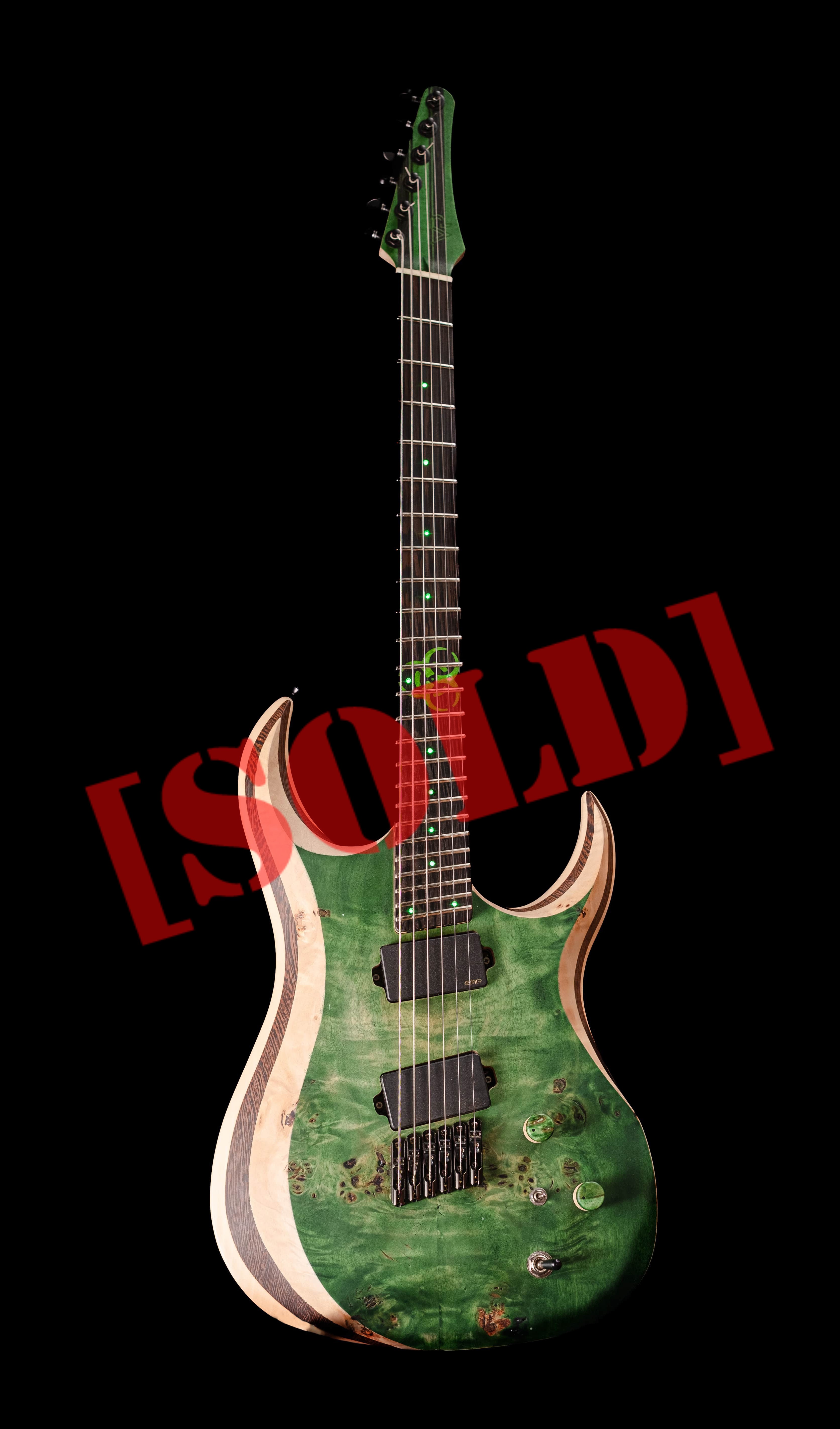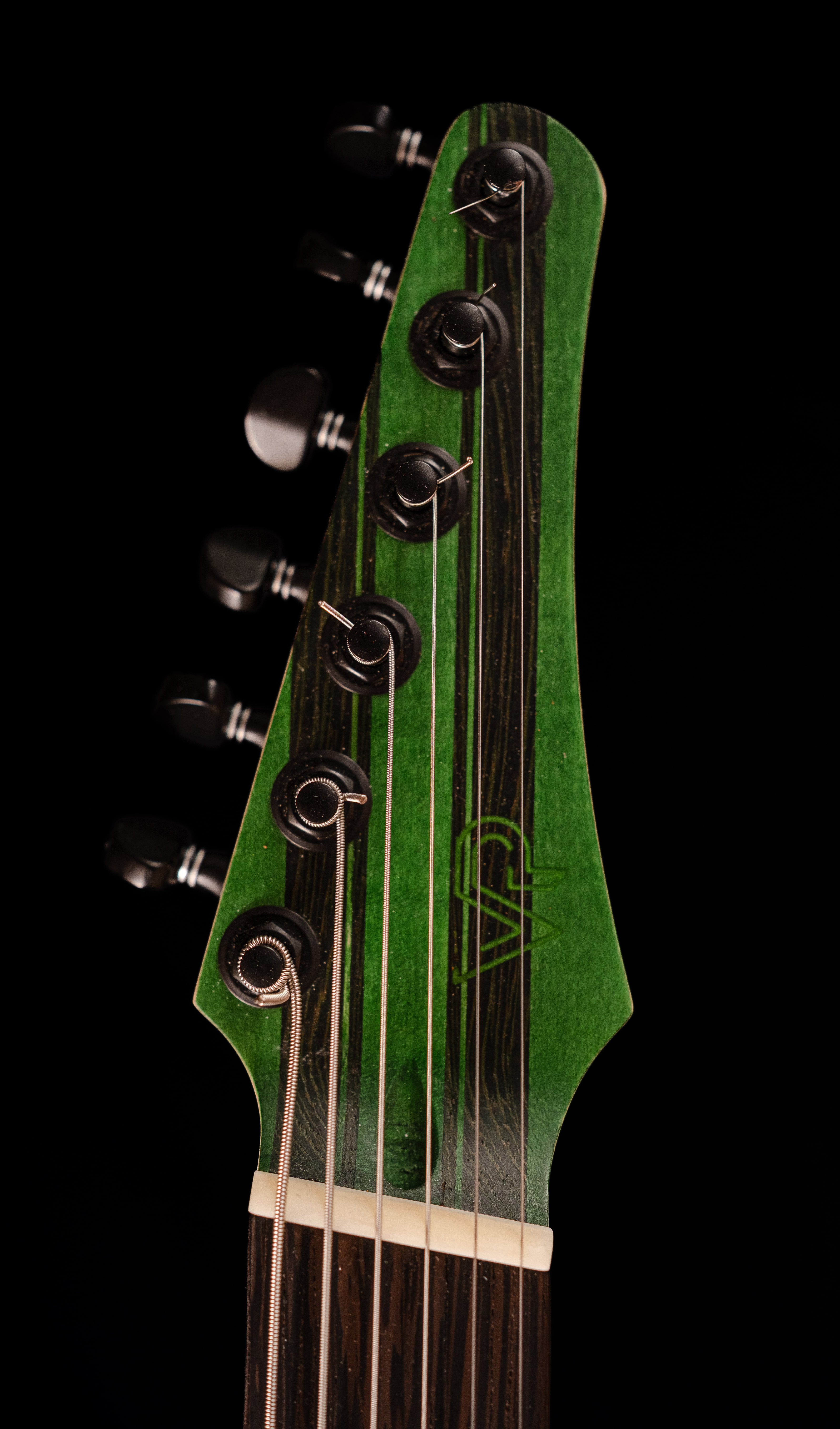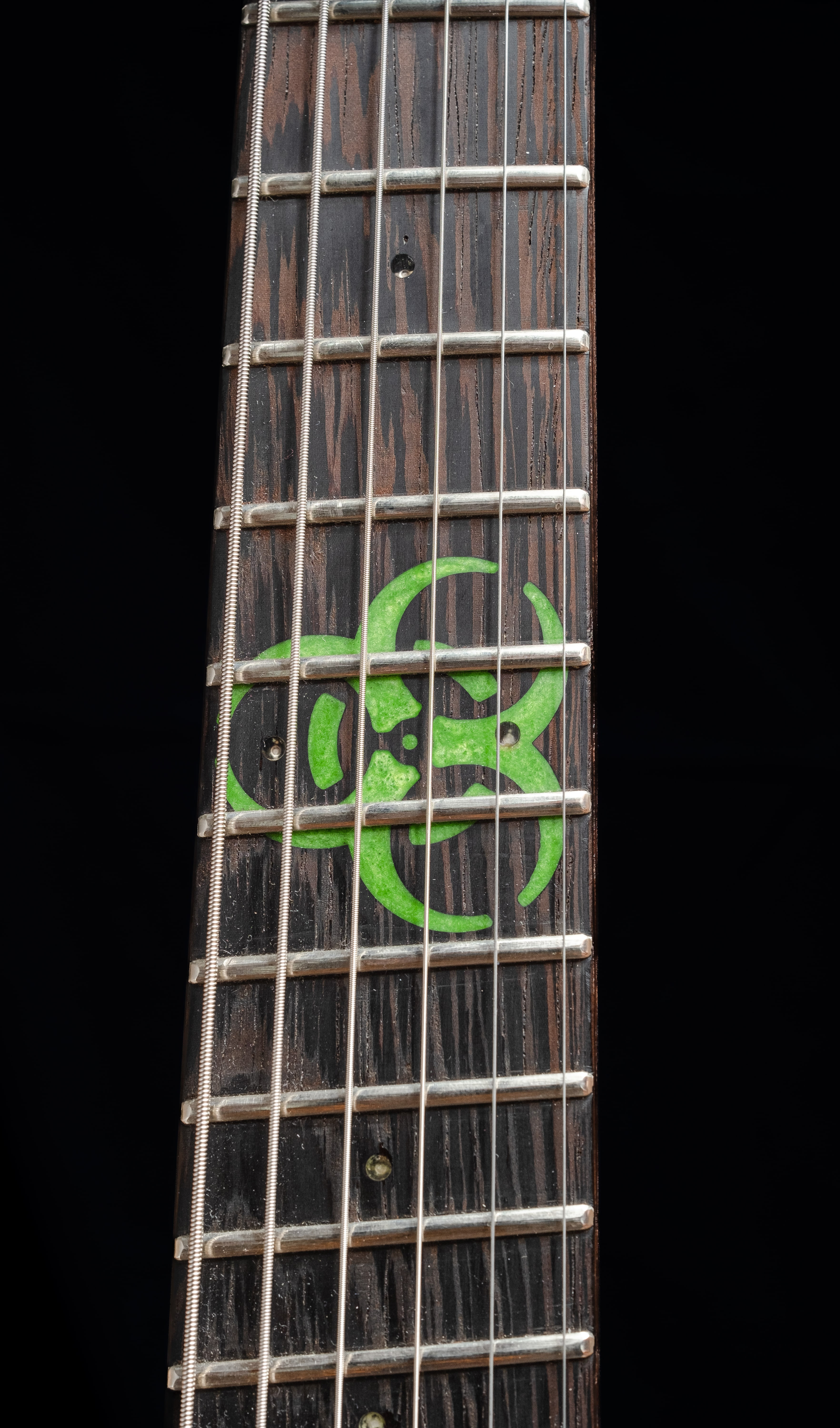Fretboard: 25.5” – 24.75” ebony, 16″ radius, green sidedots, green inlay, green LEDs