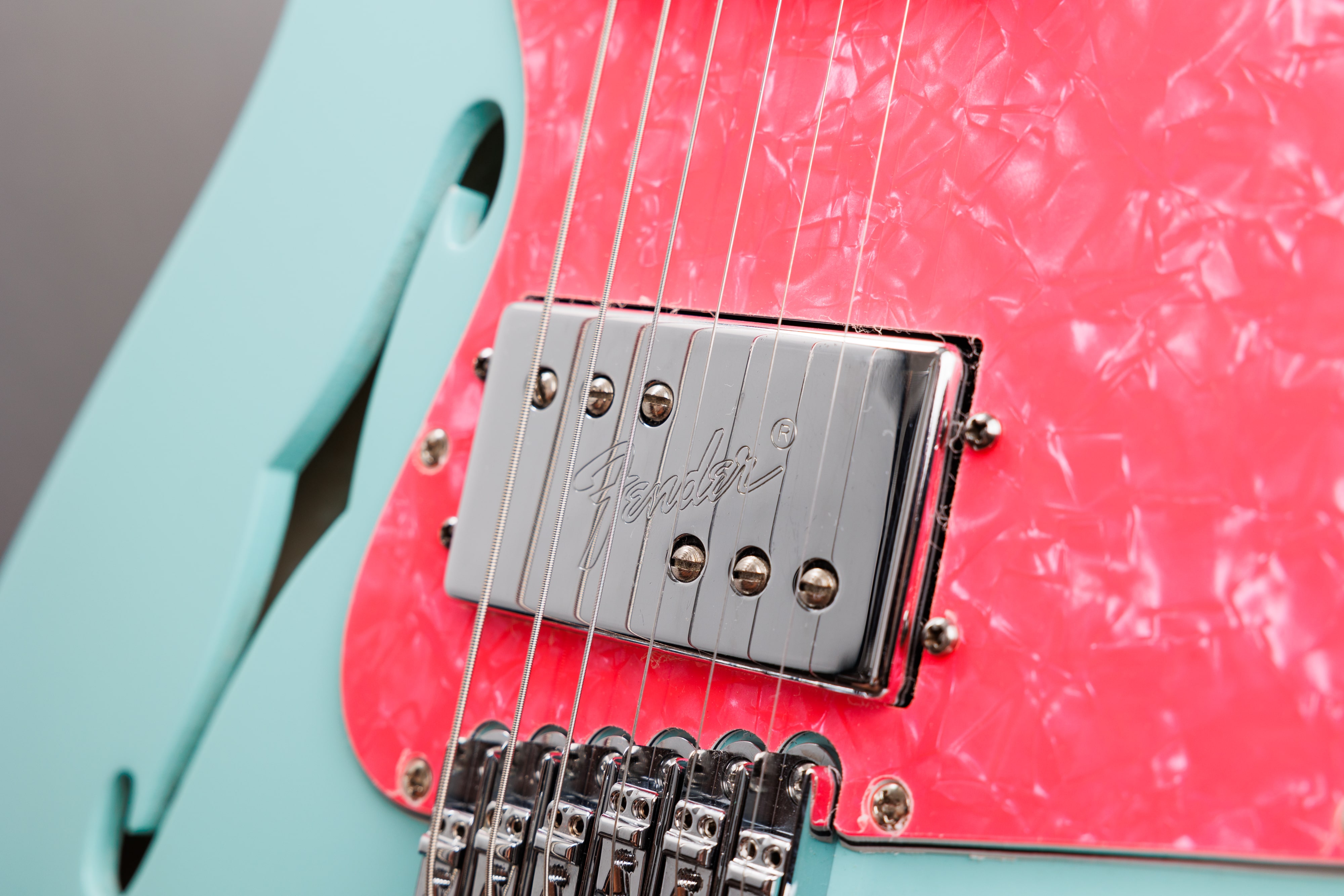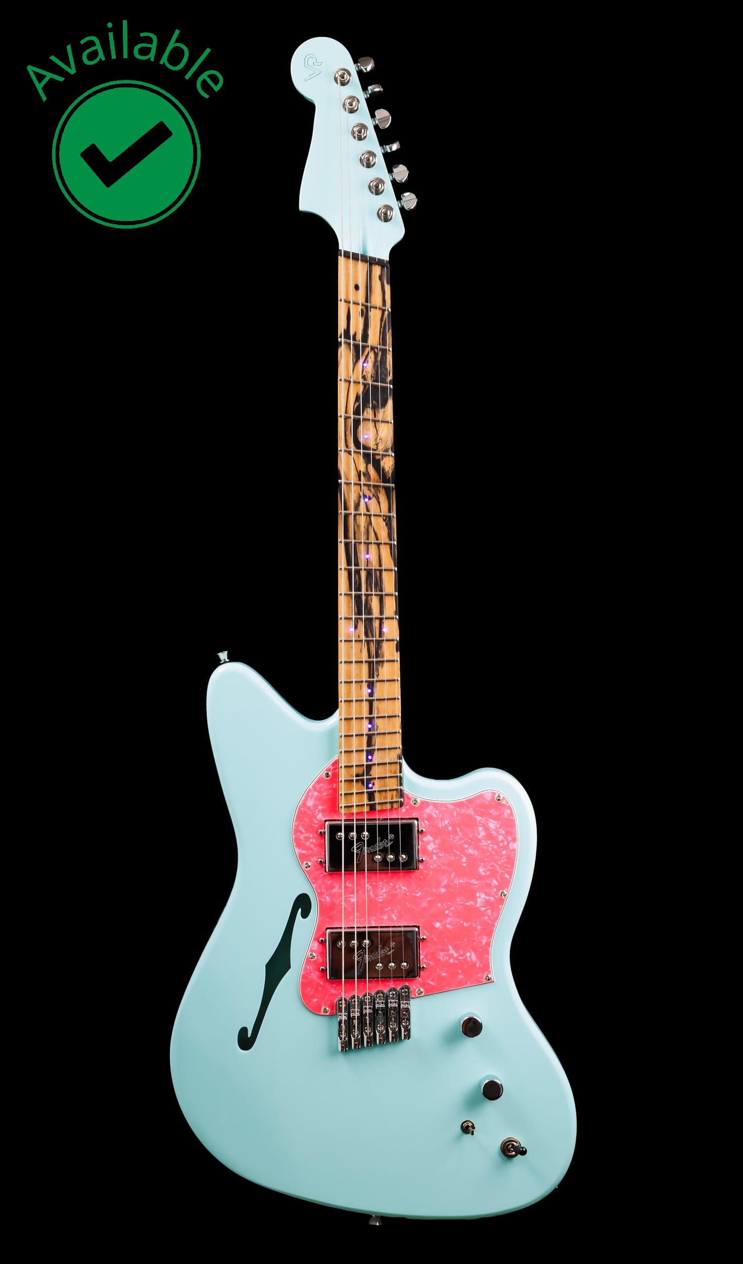 Fretboard: 25.5″ – 24.75″ pale moon ebony, 20″ radius, pink sidedots, blue led